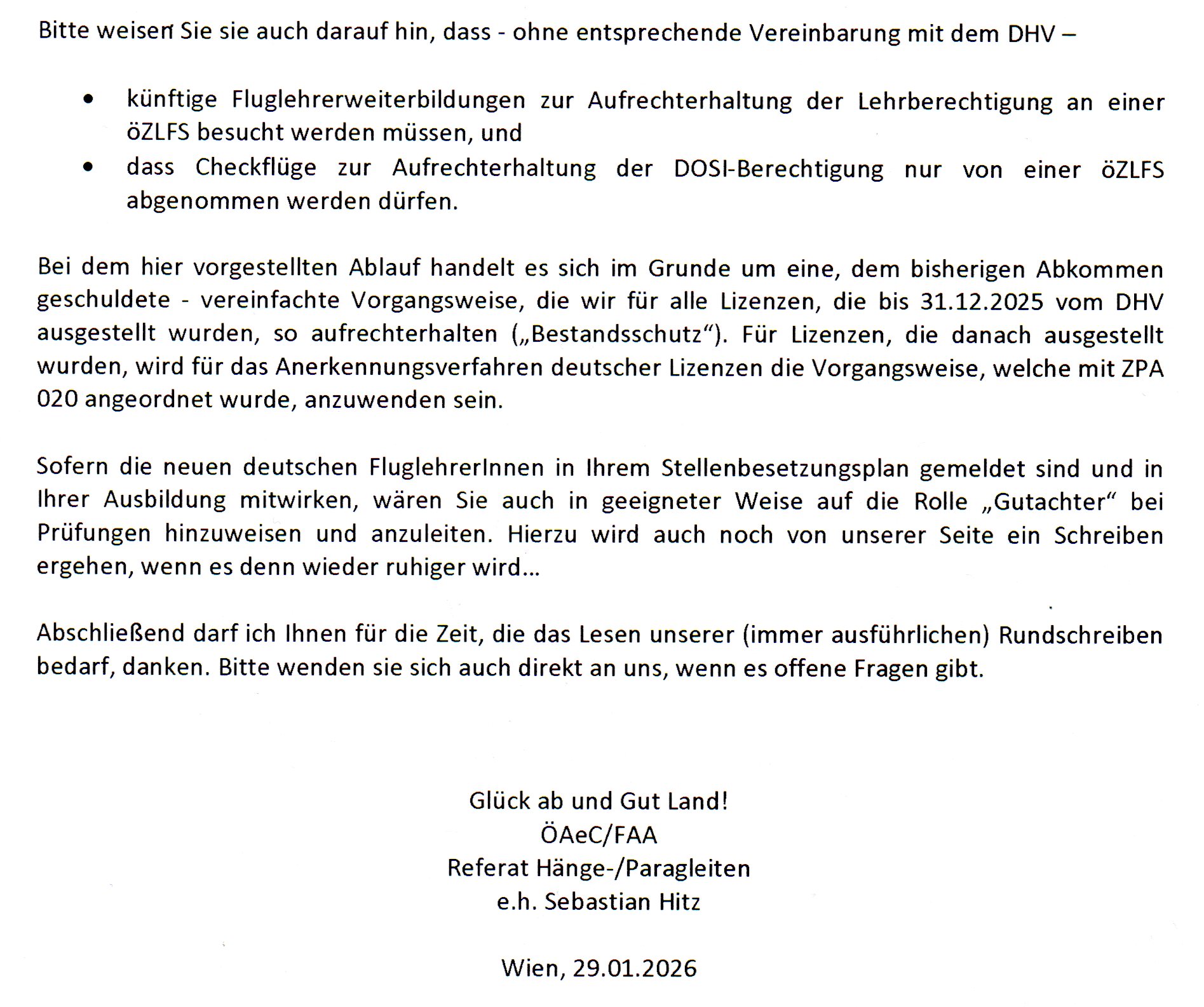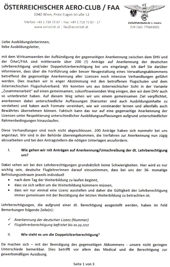 Bei den im März 2025 laufenden Gesprächen, zeichnete sich eine Lösung ab, wie ab 2026 auf mehreren Ebenen weiter kooperiert werden kann. Dies beinhaltete auch ein Angebot seitens des DHV, dass eine Ausbildung zum deutschen Luftfahrerschein in Österreich weiterhin möglich sein soll – unter leicht angepassten Ausbildungskriterien (Prüfung nach deutschen Prüfungsrichtlinien). Am 14.12.25 fand ein weiteres Gespräch zwischen Vertretern des ÖAeC und des DHV statt, ohne dass es zu einem konkreten Ergebnis gekommen ist. Die Ansätze aus den vorherigen Gesprächen wurden revidiert.