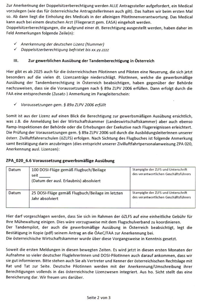 • Piloten mit Wohnsitz in Deutschland, die bis zum 31.12.2025 in Österreich den Paragleiter- bzw. Hängegleiterschein und Zusatzberechtigungen erworben haben, dürfen mit dieser Lizenz auch künftig in Deutschland tätig werden (Bestandsschutz). Unter Zusatzberechtigungen sind auch die Tandem- und Fluglehrerberechtigung zu verstehen.