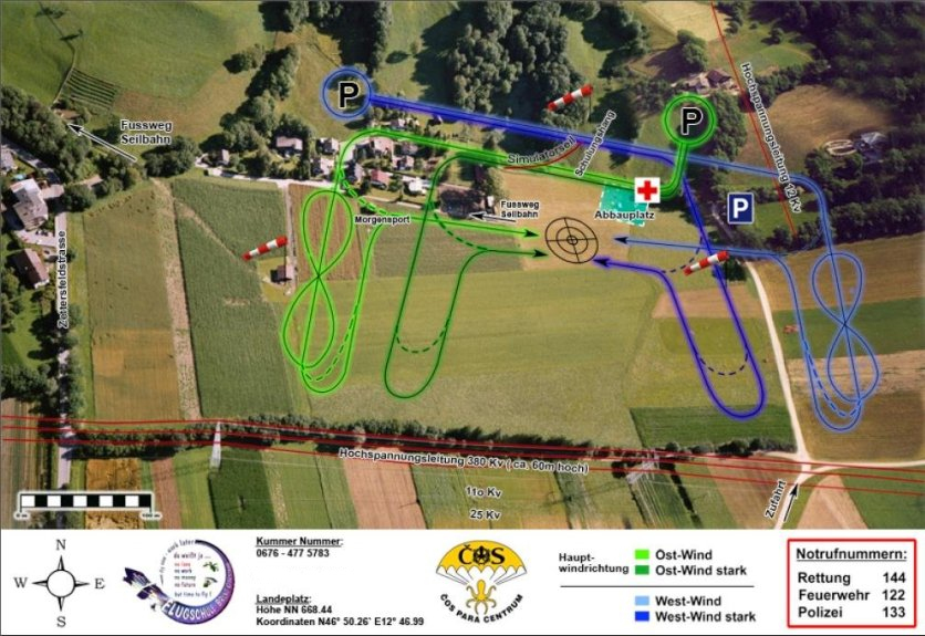 Einlanden: Achtung! Die Landevolte (Gegen-, Quer- und Endanflug) ist hier bei Westwind bedingt durch die Hochspannungsleitung ebenfalls auf der Bergseite, also rechts herum!